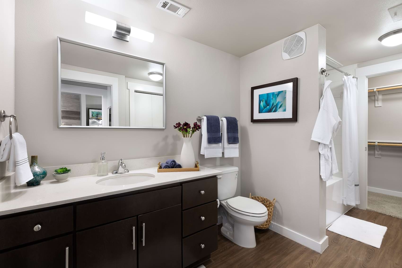 • Large well lit bathroom with white accents